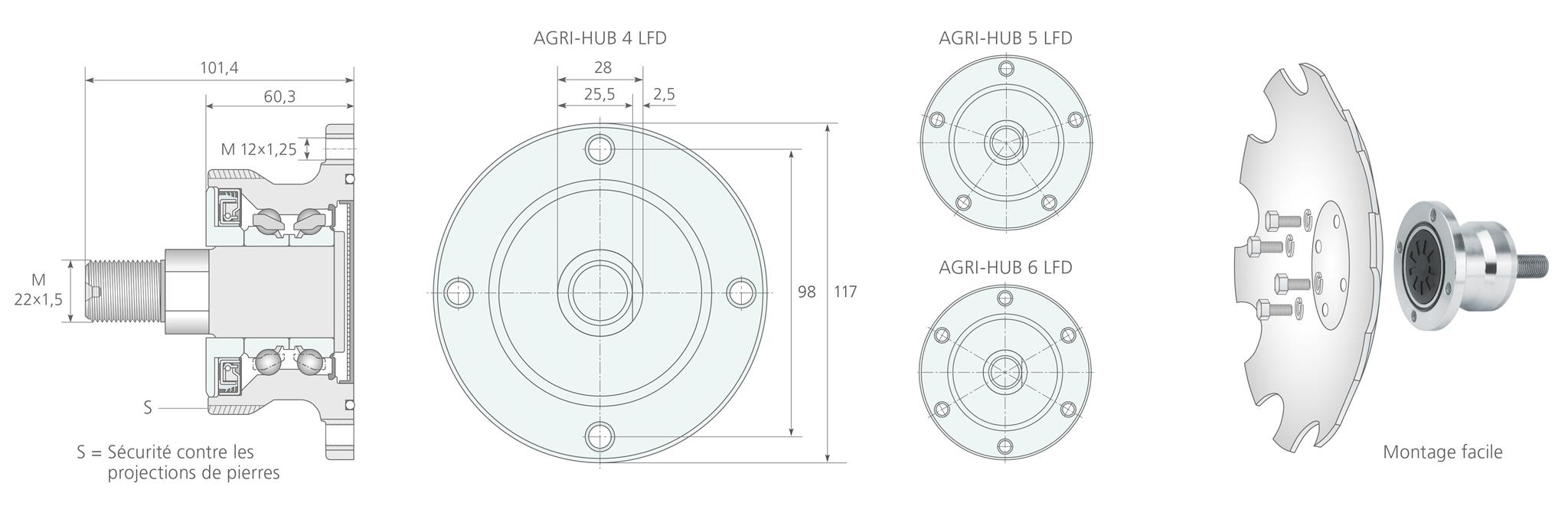 LFD propose ce palier complet également avec protection supplémentaire contre les impacts de pierres (S). De ce fait, le travail de terrain se déroule avec une fiabilité absolue. Sans entretien, les AGRI-HUBs LFD permettent un montage et démontage rapides. Ceci réduit d’autant les coûts.