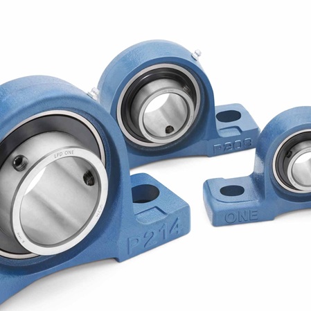 Deep-Groove Ball Bearings, Angular Contact Ball Bearings, Thrust Ball Bearings, Self-Aligning Ball Bearings, Spherical Roller Bearings, Cylindrical Roller Bearings, Tapered Roller Bearings, 2-Parts Plummer Block Housings, Pillow Blocks and Flanged Bearings of grey cast iron / pressed steel, Spherical Plain Bearings, Rod End Bearings, Needle Bushes, Adapter Sleeves/Nuts, Locking Washers
